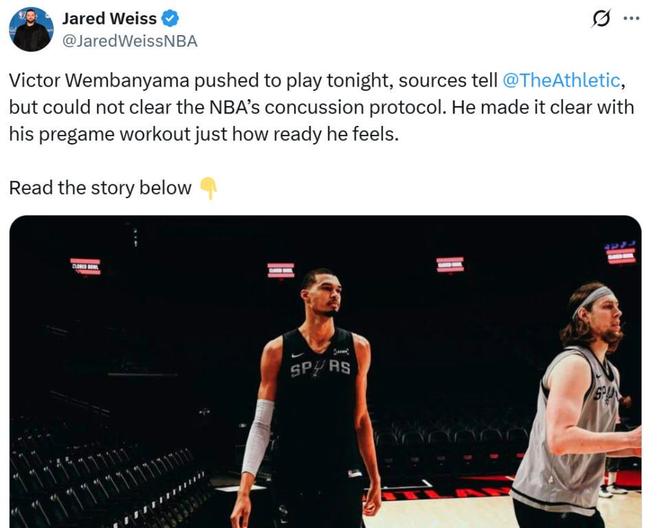 赛前马刺官方宣布文班亚马因触发脑震荡保护协议缺席本场比赛。